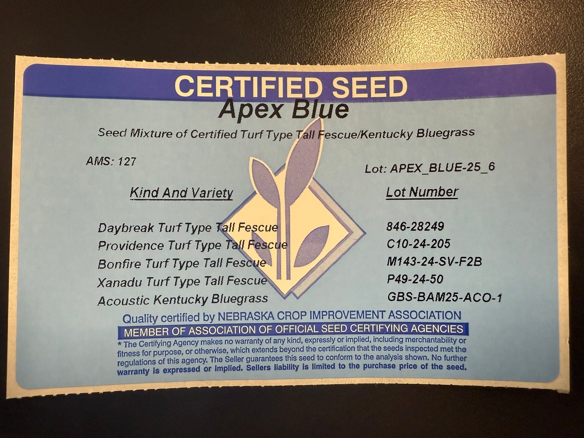 Apex Blue TTTF is a blend of four of the very best turf type tall fescue varieties along with Acoustic KBG added for a darker color and self repairing capabilities! Varieties have been hand selected based on NTEP 2023 data for drought tolerance, genetic color, disease resistance, leaf texture, and wear tolerance!