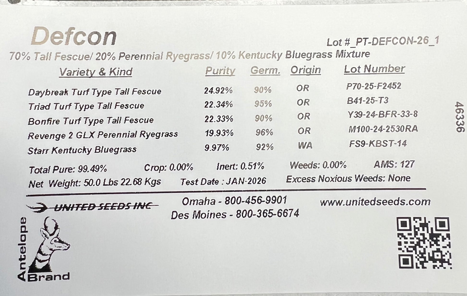 Defcon is a 3 way blend of the very best TTTF/PRG/KBG cultivars! Cultivars were hand selected based on the latest NTEP data for disease resistance while not sacrificing color and drought tolerance! This 60/20/10 blend will give you the durabilty of a TTTF lawn and enhanced color from the PRG & KBG. It also provides self repair capability from the KBG.