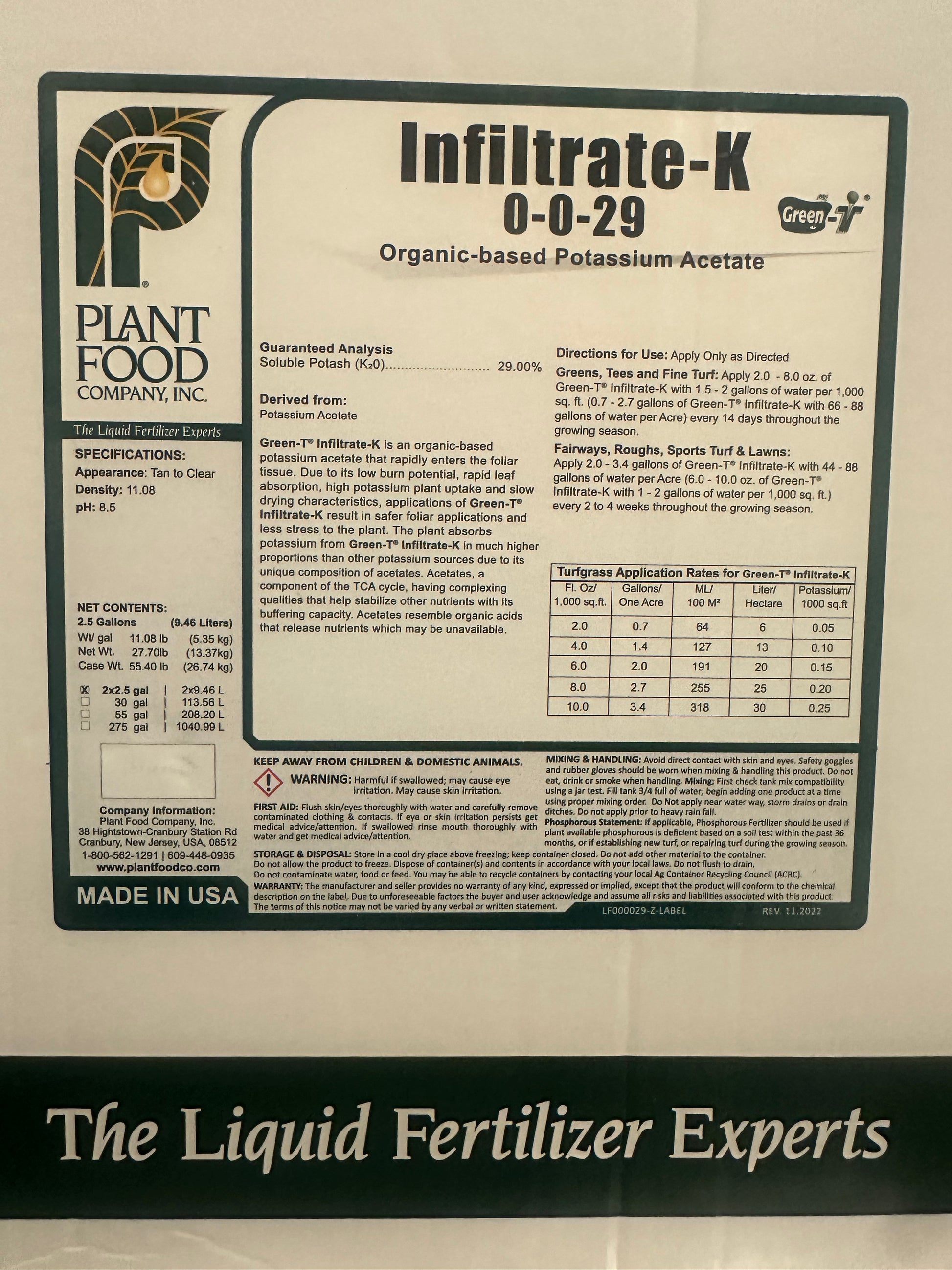 Green-T® Infiltrate-K 0-0-29 is an organic based potassium acetate that rapidly enters the foliar tissue. Due to its low burn potential, rapid leaf absorption, high potassium plant uptake and slow drying characteristics, applications of Green-T® Infiltrate-K 0-0-29 result in safer foliar applications and less stress on the plant.