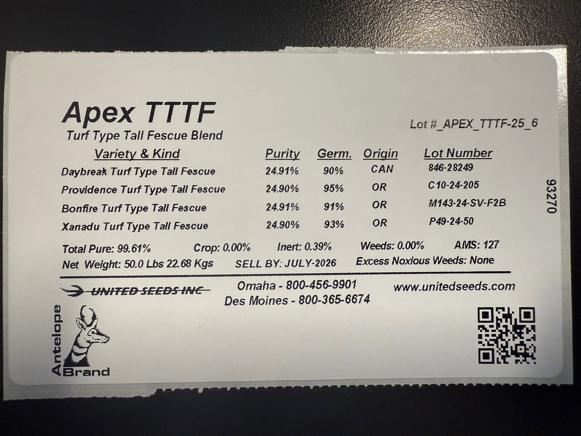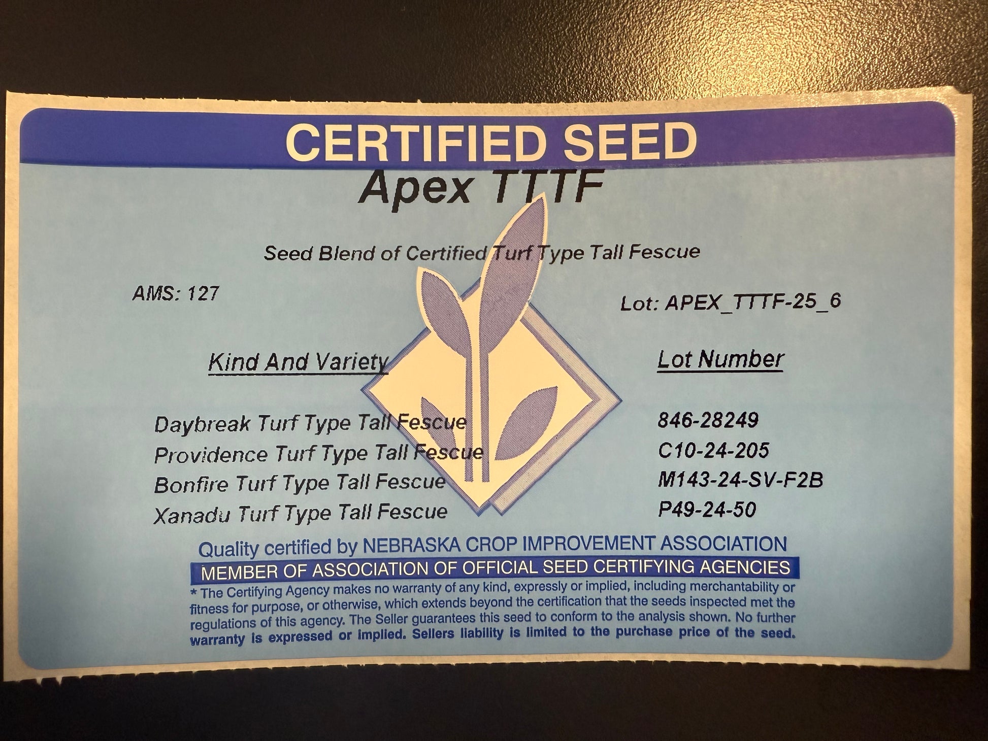Apex TTTF is a blend of four of the very best turf type tall fescue varieties! Varieties have been hand selected based on NTEP 2023 data for drought tolerance, genetic color, disease resistance, leaf texture, and wear tolerance!
