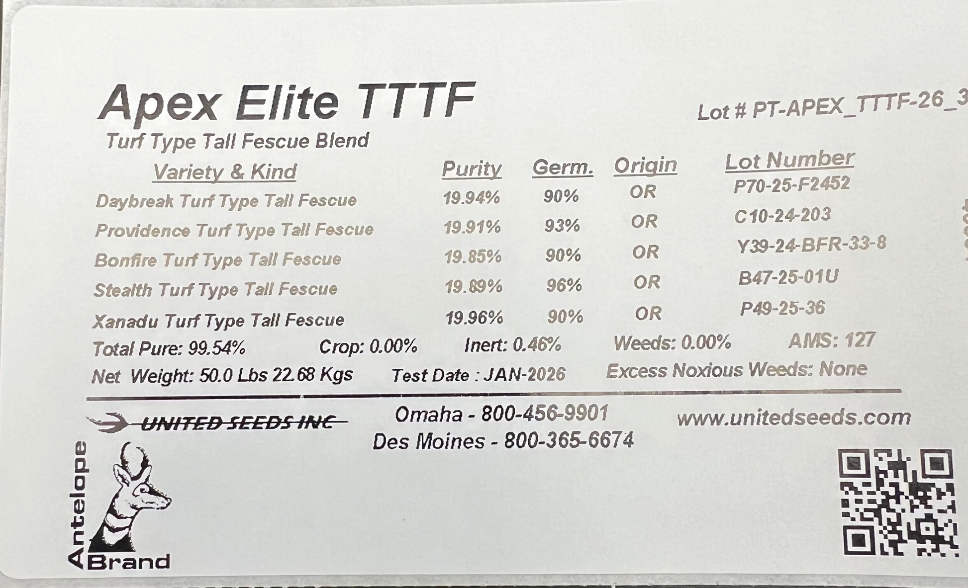 Apex Elite is a 5 way blend of the very best TTTF cultivars available! Cultivars were hand selected based on the latest NTEP data for drought tolerance, genetic color, disease resistance, leaf texture, and wear tolerance! Blue Tag Certified 0% crop 0% weed!